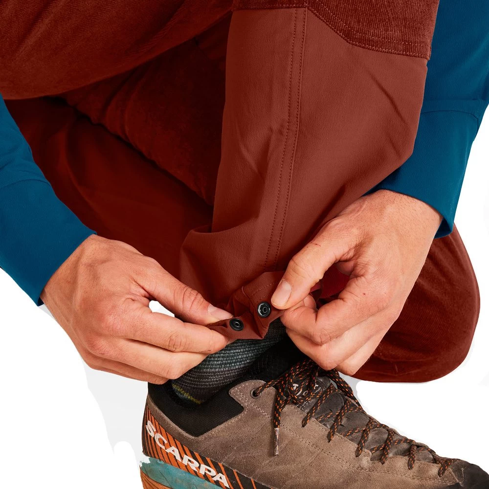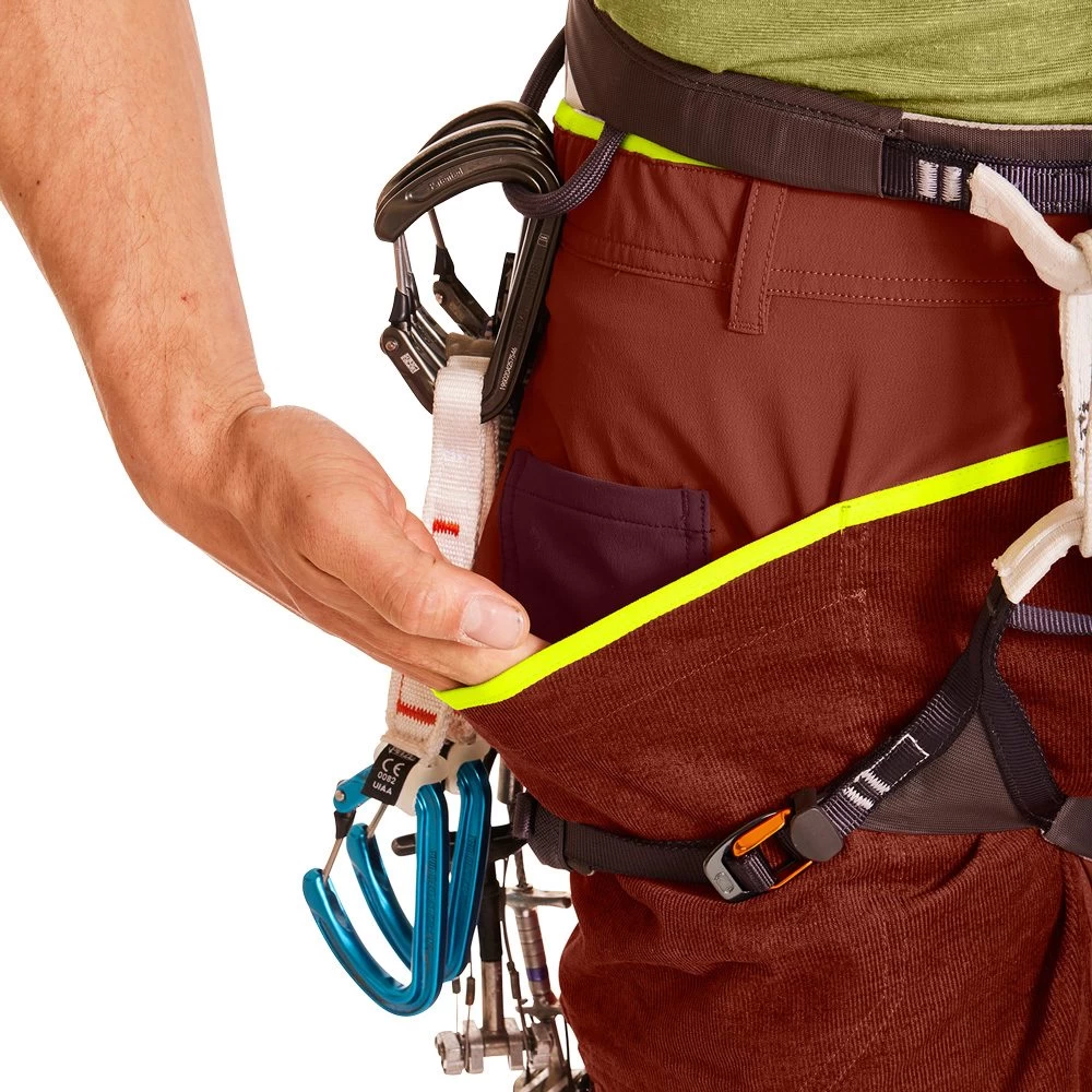 Der lässige Cord-Stoff mit nachhaltig angebautem Hanf und Bio Baumwolle ist besonders angenehm zu tragen, wobei Elastan für volle Bewegungsfreiheit sorgt. An besonders beanspruchten Stellen ist die CASALE PANTS für Herren mit elastischem und extrem abriebfesten MERINO SHIELD TEC Material ausgestattet, wobei feine Merinowolle von innen für ein gutes Klima sorgt. Dank vorgeformtem Kniebereich und Stoffeinsatz im Schritt macht die robuste Kletterhose zudem jede athletische Bewegung mit. Der Rückenbereich bleibt durch den höher sitzenden, elastischen Bund auch unter dem Klettergurt immer gut geschützt. Die nahtverdeckte Reißverschlusstasche am Oberschenkel ist so platziert, dass sie trotz Klettergurt immer gut erreichbar ist.